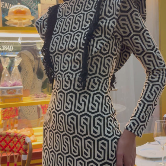 Original lapels with inner shoulder pads. Contrasting fringe details on the seams. Midi length and invisible zipper on the back.