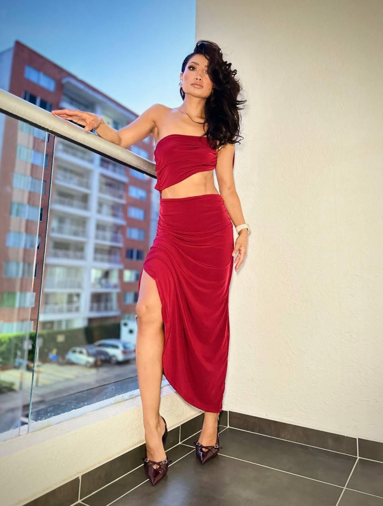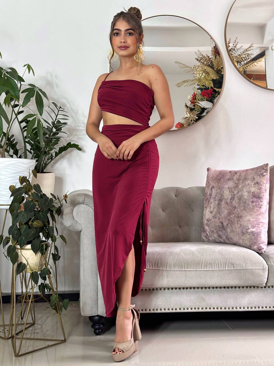 Zweiteiliges Set aus fließendem Jerseystoff, das die Figur elegant betont. Das Bandeau-Top ist seitlich gerafft und passt sich angenehm dem Körper an. Der lange Rock verfügt über eine seitliche Raffung mit einem leichten Schlitz, der für Bewegung und eine feminine Silhouette sorgt. Ein stilvolles Outfit für besondere Anlässe oder sommerliche Events.