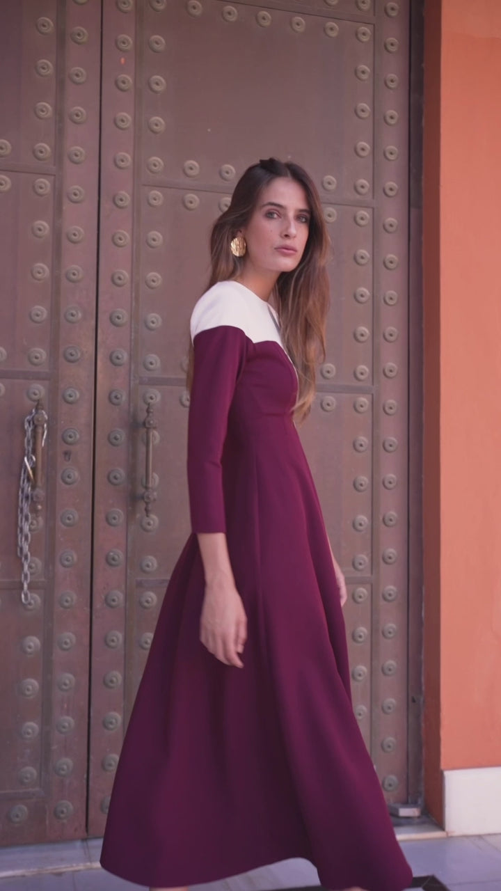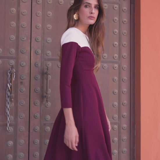 Olivia Zweifarbiges Kleid aus Bioelastik. Detail mit V-Ausschnitt. Flach geschnittener Rock