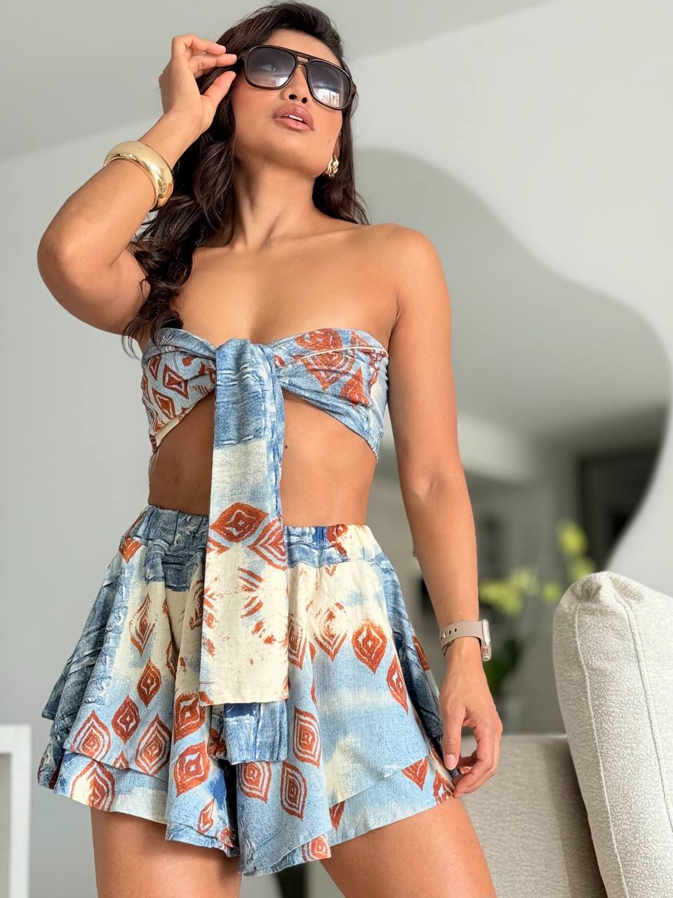 Luftiges und feminines Set in Einheitsgröße, bestehend aus einem Bandeau-Top mit mittigem Knoten, der den oberen Bauchbereich freilässt. Die Shorts haben einen weiten, fast rockähnlichen Schnitt und einen elastischen Bund, der sich verschiedenen Körperformen angenehm anpasst. Das künstlerische Muster verleiht dem Look eine originelle, leicht boho-inspirierte Note – ideal für warme Tage und sommerliche Outfits.