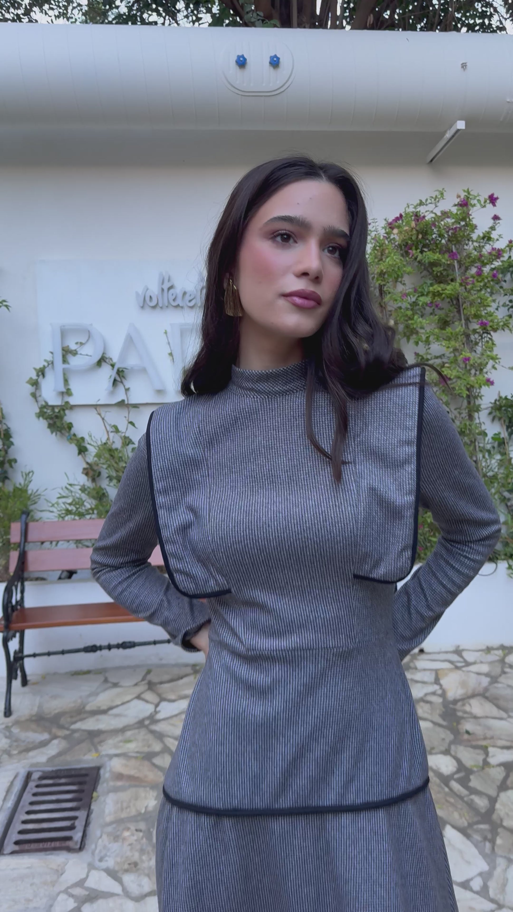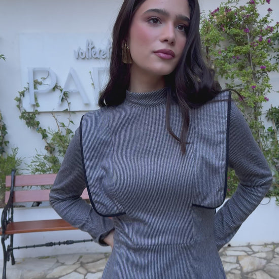 Details mit Revers und schwarzen Paspeln. Tiefer Taillenschnitt. Ausgestellte Rockform. Unsichtbarer Reißverschluss am Rücken.