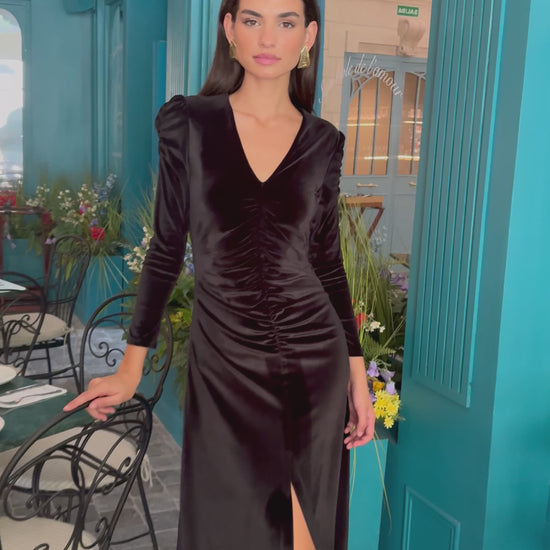 Gerafftes Detail an der Brust. Lange Ärmel. Unsichtbarer Reißverschluss.